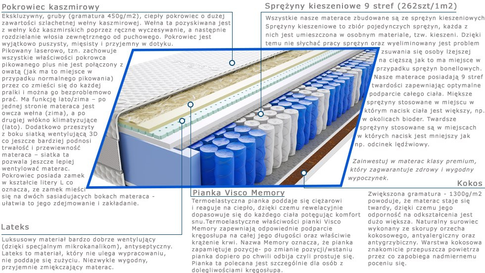 kokos, lateks, owcza-welna, pianka-hr, pianka-t25, pianka-visco-memory, pokrowiec-kaszmirowy, sprezyny-kieszeniowe-pocketowe, wlokno-klimatyzujace