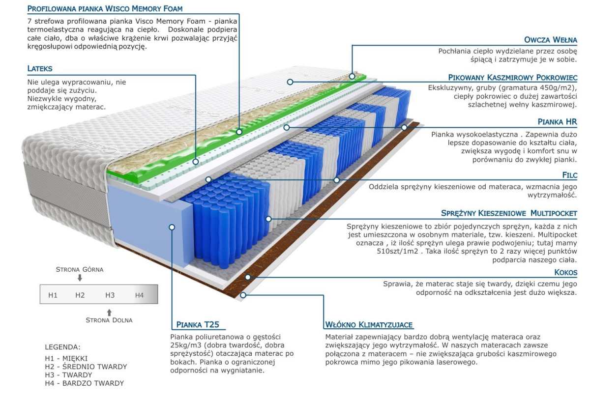 kokos, lateks, owcza-welna, pianka-hr, pianka-t25, profilowana-pianka-visco-memory, pokrowiec-kaszmirowy, sprezyny-multipocket-kieszeniowe, wlokno-klimatyzujace
