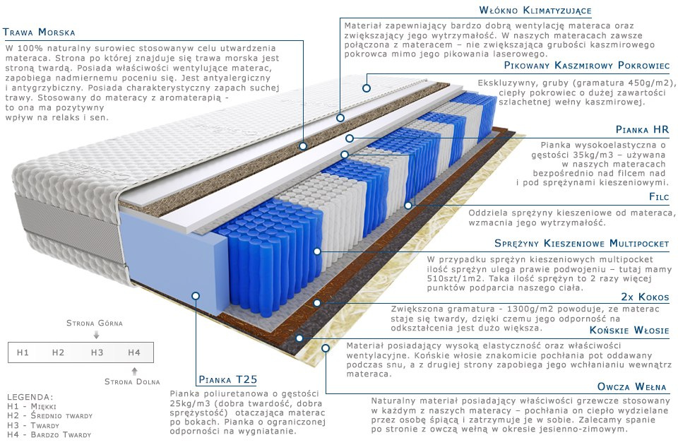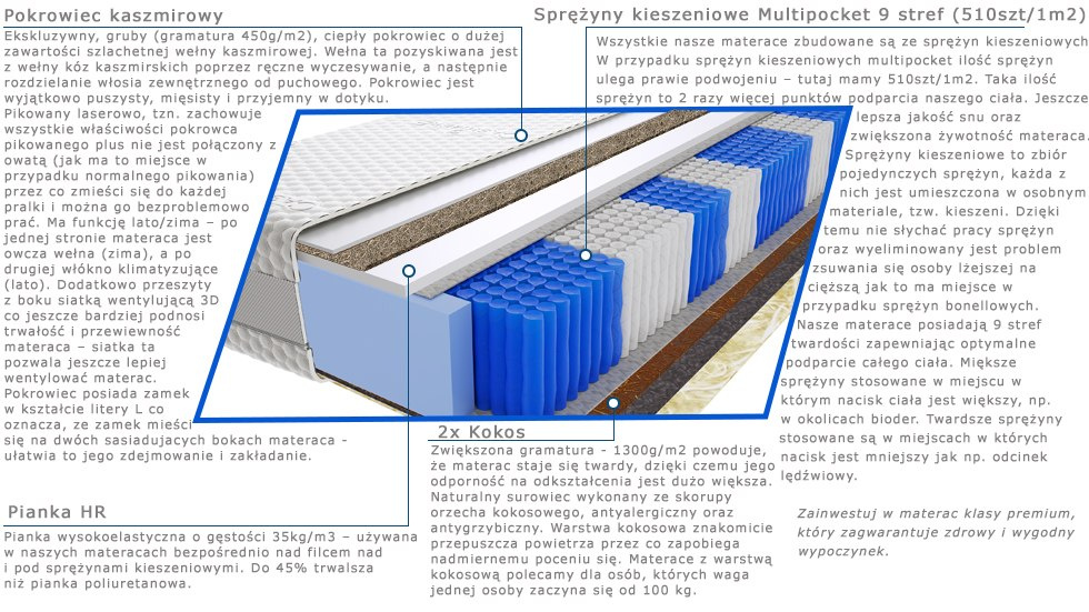 2x-kokos, konskie-wlosie, trawa-morska, owcza-welna, pianka-hr, pianka-t25, pokrowiec-kaszmirowy, sprezyny-multipocket-kieszeniowe, wlokno-klimatyzujace