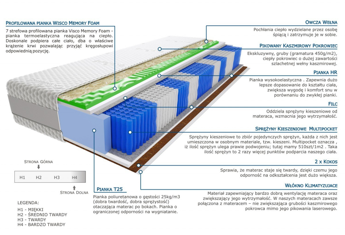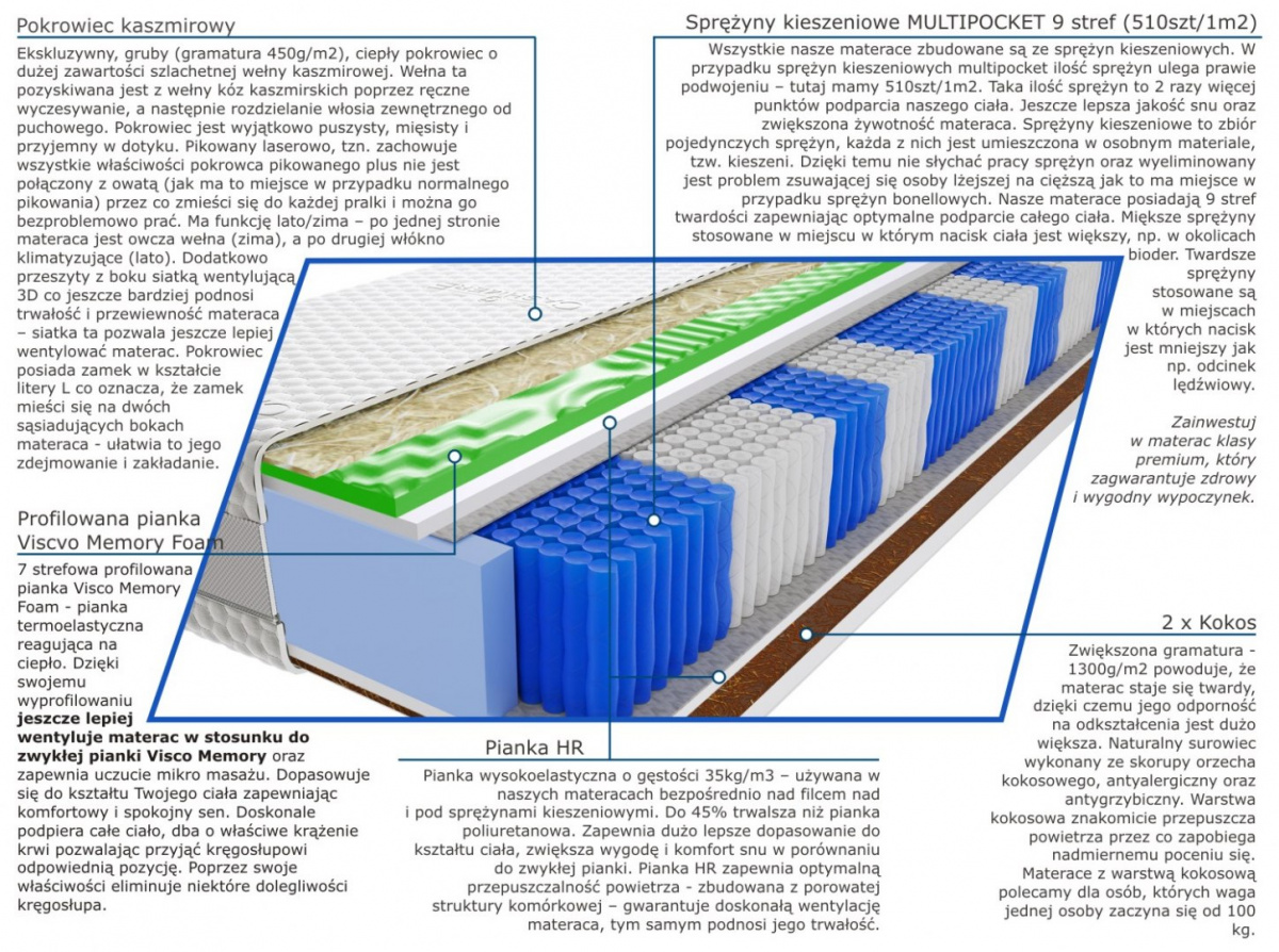 2x-kokos, owcza-welna, pianka-hr, pianka-t25, profilowana-pianka-visco-memory, pokrowiec-kaszmirowy, sprezyny-multipocket-kieszeniowe, wlokno-klimatyzujace