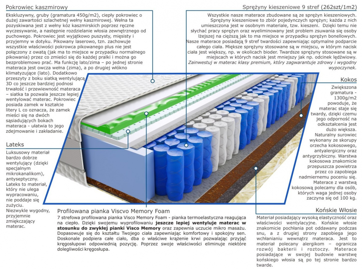 2x-kokos, konskie-wlosie, lateks, owcza-welna, pianka-hr, pianka-t25, profilowana-pianka-visco-memory, pokrowiec-kaszmirowy, sprezyny-kieszeniowe-pocketowe, wlokno-klimatyzujace