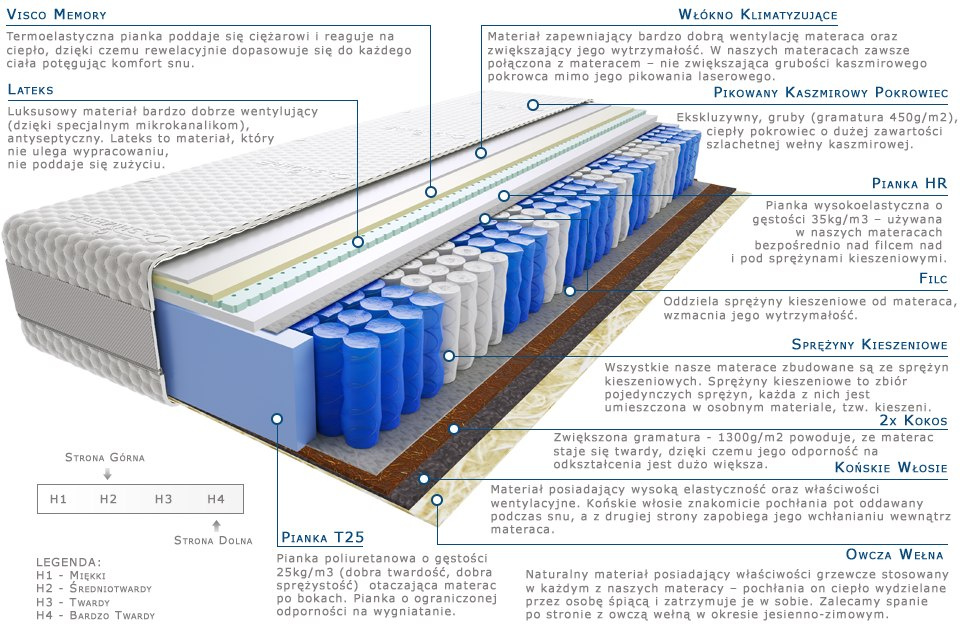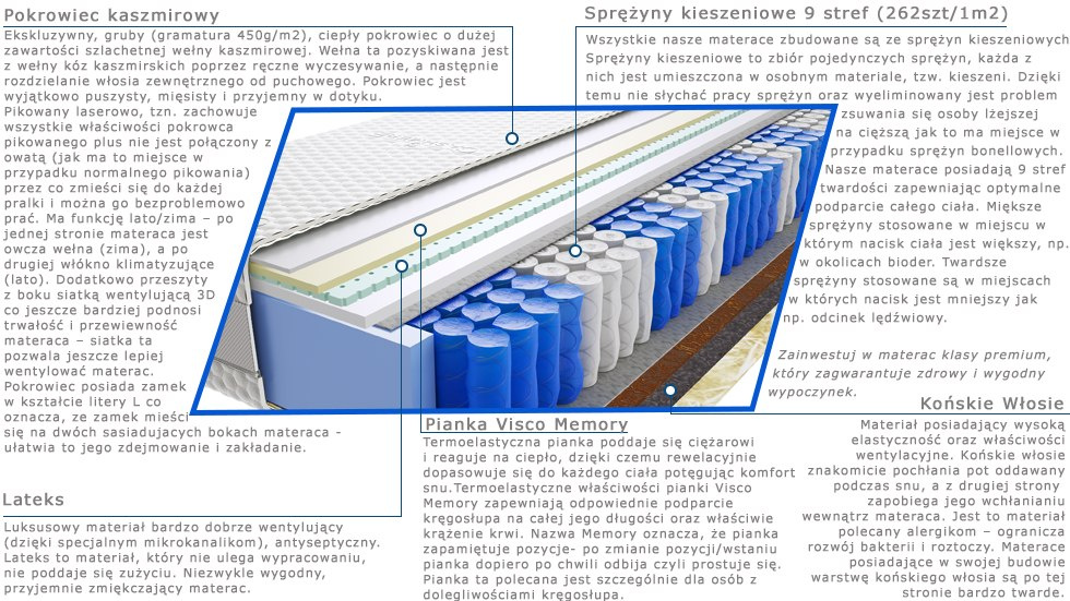 2x-kokos, konskie-wlosie, lateks, owcza-welna, pianka-hr, pianka-t25, pianka-visco-memory, pokrowiec-kaszmirowy, sprezyny-kieszeniowe-pocketowe, wlokno-klimatyzujace
