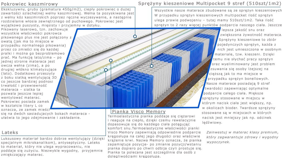 – wszystkie nasze materace zbudowane są ze sprężyn kieszeniowych. W przypadku sprężyn kieszeniowych multipocket ilość sprężyn ulega prawie podwojeniu – tutaj mamy 510szt/1m2. Taka ilość sprężyn to 2 razy więcej punktów podparcia naszego ciała. Jeszcze lepsza jakość snu oraz zwiększona żywotność materaca. Sprężyny kieszeniowe to zbiór pojedynczych sprężyn, każda z nich jest umieszczona w osobnym materiale, tzw. kieszeni. Dzięki temu nie słychać pracy sprężyn oraz wyeliminowany jest problem zsuwającej się osoby lżejszej na cięższą jak to ma miejsce w przypadku sprężyn bonellowych. Nasze materace posiadają 9 stref twardości zapewniając optymalne podparcie całego ciała. Miększe sprężyny stosowane w miejscu w którym nacisk ciała jest większy, np. w okolicach bioder. Twardsze sprężyny stosowane są w miejscach w których nacisk jest mniejszy jak np. odcinek lędźwiowy. Zainwestuj w materac klasy premium, który zagwarantuje zdrowy i wygodny wypoczynek.