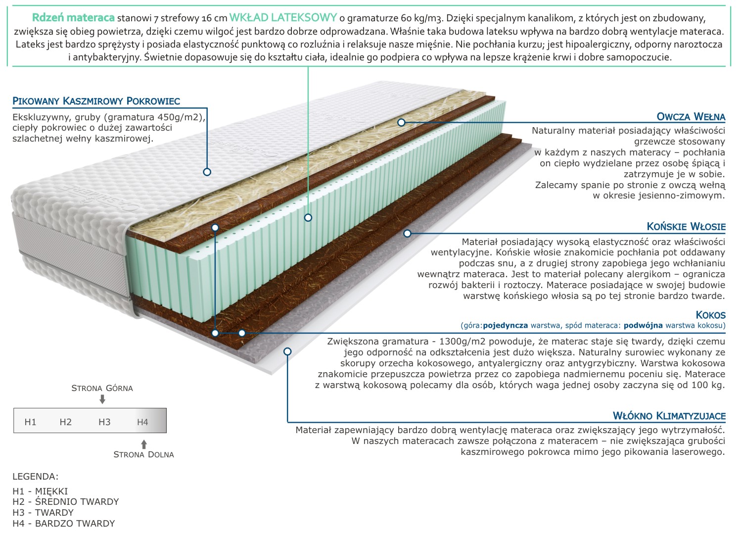 – podstawowym budulcem materaca jest wkład lateksowy o gramaturze 60 kg/m3 i wysokości 16 cm, posiadający 7 stref. Lateks to bardzo sprężysty, trwały i nie ulegający wypracowaniu surowiec. Dzięki licznym mikrokanalikom zwiększającym cyrkulację powietrza materac jest doskonale wentylowany oraz w jego wnętrzu nie gromadzi się wilgoć. Cechą charakterystyczną lateksu jest doskonała elastyczność punktowa. Dzięki niej ciało jest doskonale wsparte na całej długości, nie zapada się. Materac lateksowy gwarantuje rozluźnienie i odprężenie mięśni oraz wspomaga prawidłową cyrkulację krwi. Lateks ma właściwości antybakteryjne, hipoalergiczne, nie gromadzi się w nim kurz i nie namnażają drobnoustroje oraz roztocza.