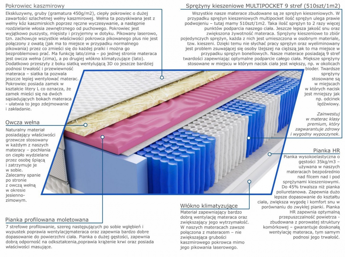 – wszystkie nasze materace zbudowane są ze sprężyn kieszeniowych. W przypadku sprężyn kieszeniowych multipocket ilość sprężyn ulega prawie podwojeniu – tutaj mamy 510szt/1m2. Taka ilość sprężyn to 2 razy więcej punktów podparcia naszego ciała. Jeszcze lepsza jakość snu oraz zwiększona żywotność materaca. Sprężyny kieszeniowe to zbiór pojedynczych sprężyn, każda z nich jest umieszczona w osobnym materiale, tzw. kieszeni. Dzięki temu nie słychać pracy sprężyn oraz wyeliminowany jest problem zsuwającej się osoby lżejszej na cięższą jak to ma miejsce w przypadku sprężyn bonellowych. Nasze materace posiadają 9 stref twardości zapewniając optymalne podparcie całego ciała. Miększe sprężyny stosowane w miejscu w którym nacisk ciała jest większy, np. w okolicach bioder. Twardsze sprężyny stosowane są w miejscach w których nacisk jest mniejszy jak np. odcinek lędźwiowy. Zainwestuj w materac klasy premium, który zagwarantuje zdrowy i wygodny wypoczynek.