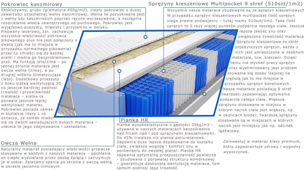 – wszystkie nasze materace zbudowane są ze sprężyn kieszeniowych. W przypadku sprężyn kieszeniowych multipocket ilość sprężyn ulega prawie podwojeniu – tutaj mamy 510szt/1m2. Taka ilość sprężyn to 2 razy więcej punktów podparcia naszego ciała. Jeszcze lepsza jakość snu oraz zwiększona żywotność materaca. Sprężyny kieszeniowe to zbiór pojedynczych sprężyn, każda z nich jest umieszczona w osobnym materiale, tzw. kieszeni. Dzięki temu nie słychać pracy sprężyn oraz wyeliminowany jest problem zsuwającej się osoby lżejszej na cięższą jak to ma miejsce w przypadku sprężyn bonellowych. Nasze materace posiadają 9 stref twardości zapewniając optymalne podparcie całego ciała. Miększe sprężyny stosowane w miejscu w którym nacisk ciała jest większy, np. w okolicach bioder. Twardsze sprężyny stosowane są w miejscach w których nacisk jest mniejszy jak np. odcinek lędźwiowy. Zainwestuj w materac klasy premium, który zagwarantuje zdrowy i wygodny wypoczynek.