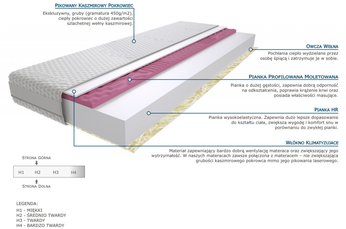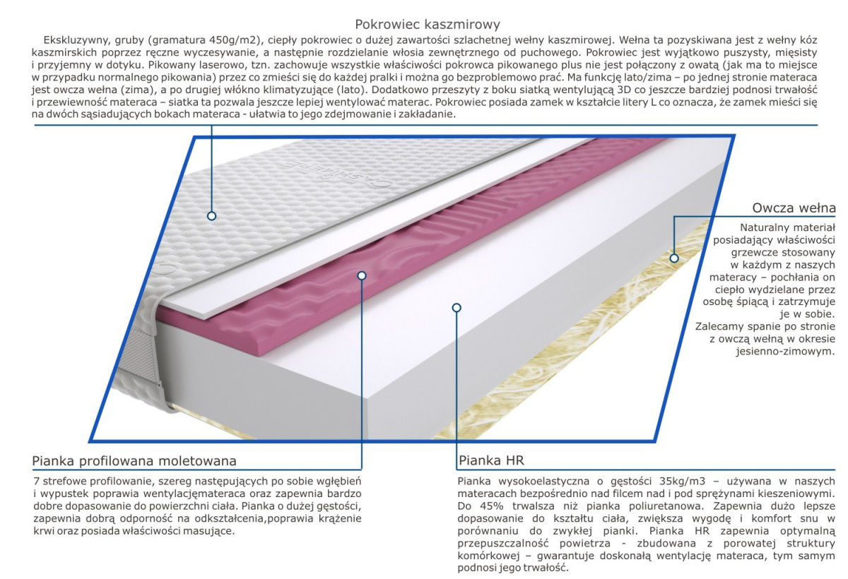 – ekskluzywny, gruby (gramatura 450g/m2), ciepły pokrowiec o dużej zawartości szlachetnej wełny kaszmirowej. Wełna ta pozyskiwana jest z wełny kóz kaszmirskich poprzez ręczne wyczesywanie, a następnie rozdzielanie włosia zewnętrznego od puchowego. Pokrowiec jest wyjątkowo puszysty, mięsisty i przyjemny w dotyku. Pikowany laserowo, tzn. zachowuje wszystkie właściwości pokrowca pikowanego plus nie jest połączony z owatą (jak ma to miejsce w przypadku normalnego pikowania) przez co zmieści się do każdej pralki i można go bezproblemowo prać. Ma funkcję lato/zima – po jednej stronie materaca jest owcza wełna (zima), a po drugiej włókno klimatyzujące (lato). Dodatkowo przeszyty z boku siatką wentylującą 3D co jeszcze bardziej podnosi trwałość i przewiewność materaca – siatka ta pozwala jeszcze lepiej wentylować materac. Pokrowiec posiada zamek w kształcie litery L co oznacza, ze zamek mieści się na dwóch sąsiadujących bokach materaca – ułatwia to jego zdejmowanie i zakładanie.