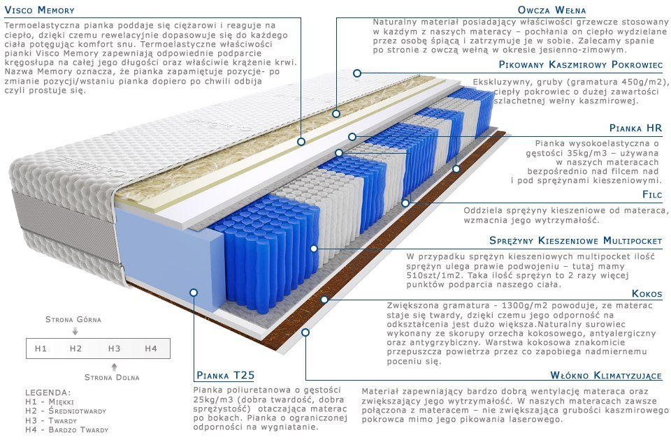 kokos, owcza-welna, pianka-hr, pianka-t25, pianka-visco-memory, pokrowiec-kaszmirowy, sprezyny-multipocket-kieszeniowe, wlokno-klimatyzujace