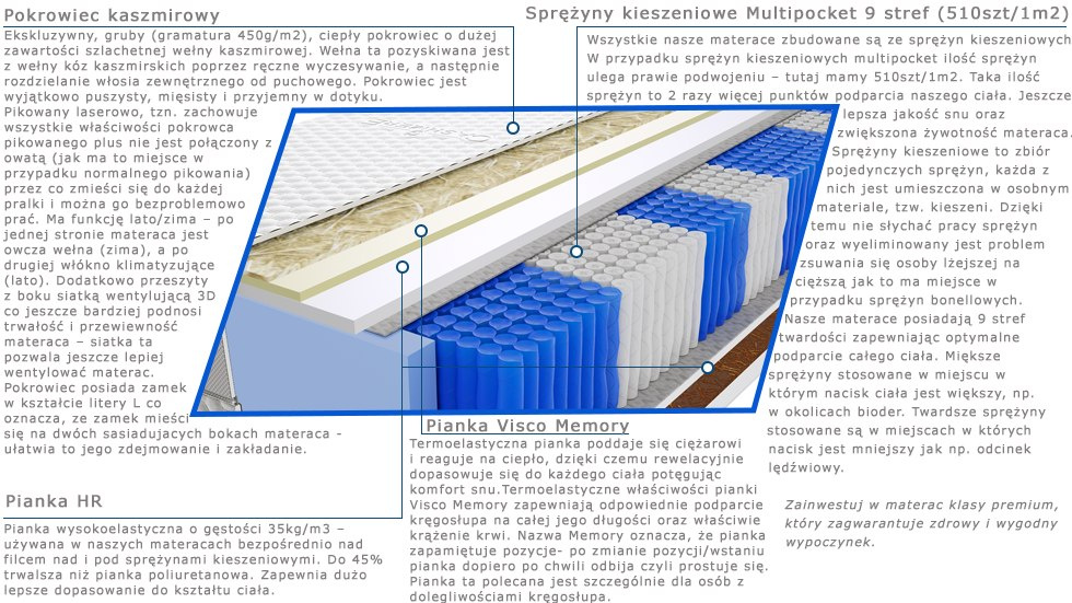 – wszystkie nasze materace zbudowane są ze sprężyn kieszeniowych. W przypadku sprężyn kieszeniowych multipocket ilość sprężyn ulega prawie podwojeniu – tutaj mamy 510szt/1m2. Taka ilość sprężyn to 2 razy więcej punktów podparcia naszego ciała. Jeszcze lepsza jakość snu oraz zwiększona żywotność materaca. Sprężyny kieszeniowe to zbiór pojedynczych sprężyn, każda z nich jest umieszczona w osobnym materiale, tzw. kieszeni. Dzięki temu nie słychać pracy sprężyn oraz wyeliminowany jest problem zsuwającej się osoby lżejszej na cięższą jak to ma miejsce w przypadku sprężyn bonellowych. Nasze materace posiadają 9 stref twardości zapewniając optymalne podparcie całego ciała. Miększe sprężyny stosowane w miejscu w którym nacisk ciała jest większy, np. w okolicach bioder. Twardsze sprężyny stosowane są w miejscach w których nacisk jest mniejszy jak np. odcinek lędźwiowy. Zainwestuj w materac klasy premium, który zagwarantuje zdrowy i wygodny wypoczynek.