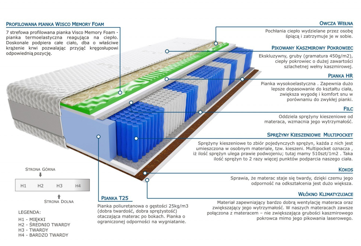 kokos, owcza-welna, pianka-hr, pianka-t25, profilowana-pianka-visco-memory, pokrowiec-kaszmirowy, sprezyny-multipocket-kieszeniowe, wlokno-klimatyzujace