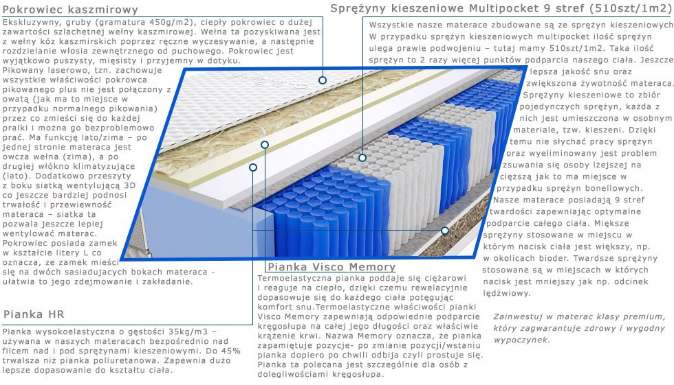 – wszystkie nasze materace zbudowane są ze sprężyn kieszeniowych. W przypadku sprężyn kieszeniowych multipocket ilość sprężyn ulega prawie podwojeniu – tutaj mamy 510szt/1m2. Taka ilość sprężyn to 2 razy więcej punktów podparcia naszego ciała. Jeszcze lepsza jakość snu oraz zwiększona żywotność materaca. Sprężyny kieszeniowe to zbiór pojedynczych sprężyn, każda z nich jest umieszczona w osobnym materiale, tzw. kieszeni. Dzięki temu nie słychać pracy sprężyn oraz wyeliminowany jest problem zsuwającej się osoby lżejszej na cięższą jak to ma miejsce w przypadku sprężyn bonellowych. Nasze materace posiadają 9 stref twardości zapewniając optymalne podparcie całego ciała. Miększe sprężyny stosowane w miejscu w którym nacisk ciała jest większy, np. w okolicach bioder. Twardsze sprężyny stosowane są w miejscach w których nacisk jest mniejszy jak np. odcinek lędźwiowy. Zainwestuj w materac klasy premium, który zagwarantuje zdrowy i wygodny wypoczynek.