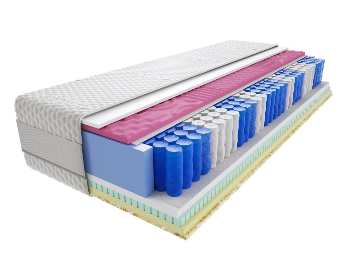 – wszystkie nasze materace zbudowane są ze sprężyn kieszeniowych. Sprężyny kieszeniowe to zbiór pojedynczych sprężyn, każda z nich jest umieszczona w osobnym materiale, tzw. kieszeni. Dzięki temu nie słychać pracy sprężyn oraz wyeliminowany jest problem zsuwającej się osoby lżejszej na cięższą jak to ma miejsce w przypadku sprężyn bonellowych. Nasze materace posiadają 9 stref twardości zapewniając optymalne podparcie całego ciała. Miększe sprężyny stosowane w miejscu w którym nacisk ciała jest większy, np. w okolicach bioder. Twardsze sprężyny stosowane są w miejscach w których nacisk jest mniejszy jak np. odcinek lędźwiowy. Zainwestuj w materac klasy premium, który zagwarantuje zdrowy i wygodny wypoczynek.