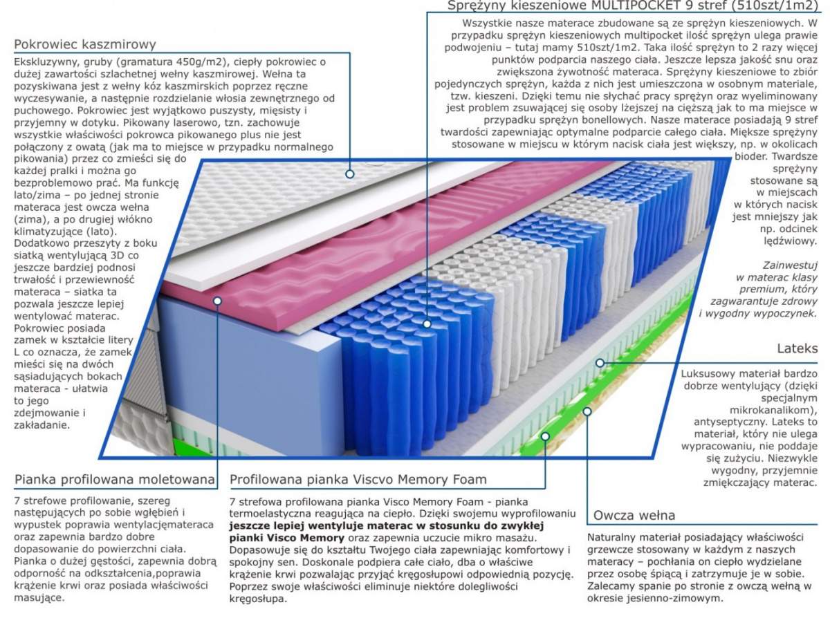 – wszystkie nasze materace zbudowane są ze sprężyn kieszeniowych. W przypadku sprężyn kieszeniowych multipocket ilość sprężyn ulega prawie podwojeniu – tutaj mamy 510szt/1m2. Taka ilość sprężyn to 2 razy więcej punktów podparcia naszego ciała. Jeszcze lepsza jakość snu oraz zwiększona żywotność materaca. Sprężyny kieszeniowe to zbiór pojedynczych sprężyn, każda z nich jest umieszczona w osobnym materiale, tzw. kieszeni. Dzięki temu nie słychać pracy sprężyn oraz wyeliminowany jest problem zsuwającej się osoby lżejszej na cięższą jak to ma miejsce w przypadku sprężyn bonellowych. Nasze materace posiadają 9 stref twardości zapewniając optymalne podparcie całego ciała. Miększe sprężyny stosowane w miejscu w którym nacisk ciała jest większy, np. w okolicach bioder. Twardsze sprężyny stosowane są w miejscach w których nacisk jest mniejszy jak np. odcinek lędźwiowy. Zainwestuj w materac klasy premium, który zagwarantuje zdrowy i wygodny wypoczynek.