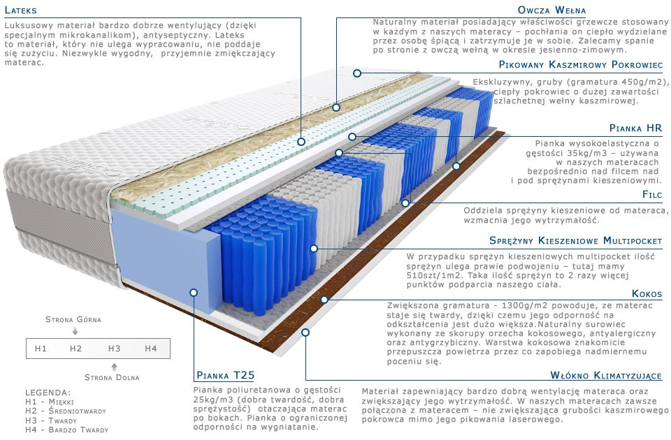 kokos, lateks, owcza-welna, pianka-hr, pianka-t25, pokrowiec-kaszmirowy, sprezyny-multipocket-kieszeniowe, wlokno-klimatyzujace