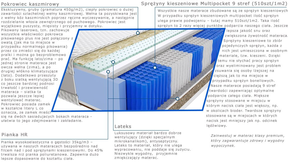 – wszystkie nasze materace zbudowane są ze sprężyn kieszeniowych. W przypadku sprężyn kieszeniowych multipocket ilość sprężyn ulega prawie podwojeniu – tutaj mamy 510szt/1m2. Taka ilość sprężyn to 2 razy więcej punktów podparcia naszego ciała. Jeszcze lepsza jakość snu oraz zwiększona żywotność materaca. Sprężyny kieszeniowe to zbiór pojedynczych sprężyn, każda z nich jest umieszczona w osobnym materiale, tzw. kieszeni. Dzięki temu nie słychać pracy sprężyn oraz wyeliminowany jest problem zsuwającej się osoby lżejszej na cięższą jak to ma miejsce w przypadku sprężyn bonellowych. Nasze materace posiadają 9 stref twardości zapewniając optymalne podparcie całego ciała. Miększe sprężyny stosowane w miejscu w którym nacisk ciała jest większy, np. w okolicach bioder. Twardsze sprężyny stosowane są w miejscach w których nacisk jest mniejszy jak np. odcinek lędźwiowy. Zainwestuj w materac klasy premium, który zagwarantuje zdrowy i wygodny wypoczynek.