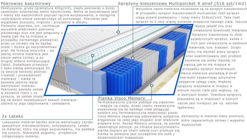 – wszystkie nasze materace zbudowane są ze sprężyn kieszeniowych. W przypadku sprężyn kieszeniowych multipocket ilość sprężyn ulega prawie podwojeniu – tutaj mamy 510szt/1m2. Taka ilość sprężyn to 2 razy więcej punktów podparcia naszego ciała. Jeszcze lepsza jakość snu oraz zwiększona żywotność materaca. Sprężyny kieszeniowe to zbiór pojedynczych sprężyn, każda z nich jest umieszczona w osobnym materiale, tzw. kieszeni. Dzięki temu nie słychać pracy sprężyn oraz wyeliminowany jest problem zsuwającej się osoby lżejszej na cięższą jak to ma miejsce w przypadku sprężyn bonellowych. Nasze materace posiadają 9 stref twardości zapewniając optymalne podparcie całego ciała. Miększe sprężyny stosowane w miejscu w którym nacisk ciała jest większy, np. w okolicach bioder. Twardsze sprężyny stosowane są w miejscach w których nacisk jest mniejszy jak np. odcinek lędźwiowy. Zainwestuj w materac klasy premium, który zagwarantuje zdrowy i wygodny wypoczynek.