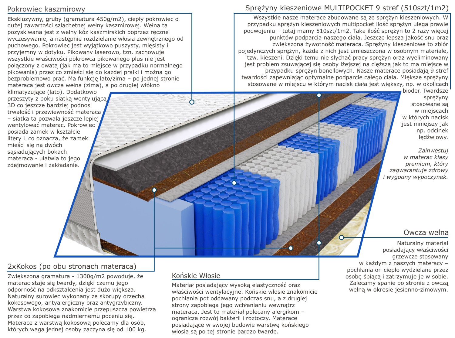 – wszystkie nasze materace zbudowane są ze sprężyn kieszeniowych. W przypadku sprężyn kieszeniowych multipocket ilość sprężyn ulega prawie podwojeniu – tutaj mamy 510szt/1m2. Taka ilość sprężyn to 2 razy więcej punktów podparcia naszego ciała. Jeszcze lepsza jakość snu oraz zwiększona żywotność materaca. Sprężyny kieszeniowe to zbiór pojedynczych sprężyn, każda z nich jest umieszczona w osobnym materiale, tzw. kieszeni. Dzięki temu nie słychać pracy sprężyn oraz wyeliminowany jest problem zsuwającej się osoby lżejszej na cięższą jak to ma miejsce w przypadku sprężyn bonellowych. Nasze materace posiadają 9 stref twardości zapewniając optymalne podparcie całego ciała. Miększe sprężyny stosowane w miejscu w którym nacisk ciała jest większy, np. w okolicach bioder. Twardsze sprężyny stosowane są w miejscach w których nacisk jest mniejszy jak np. odcinek lędźwiowy. Zainwestuj w materac klasy premium, który zagwarantuje zdrowy i wygodny wypoczynek.