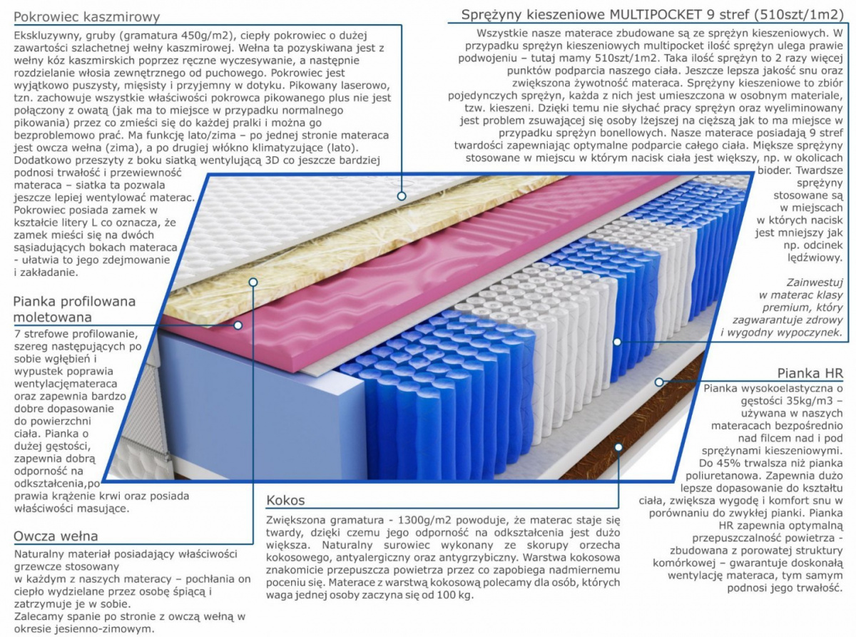kokos, owcza-welna, pianka-hr, pianka-profilowana-moletowana, pianka-t25, pokrowiec-kaszmirowy, sprezyny-multipocket-kieszeniowe, wlokno-klimatyzujace