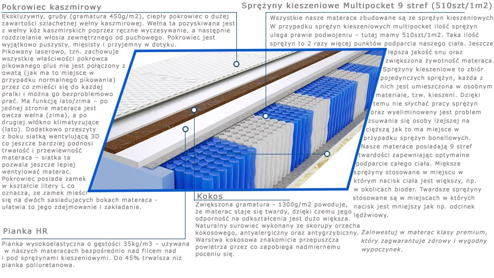 kokos, owcza-welna, pianka-hr, pianka-t25, pokrowiec-kaszmirowy, sprezyny-multipocket-kieszeniowe, wlokno-klimatyzujace