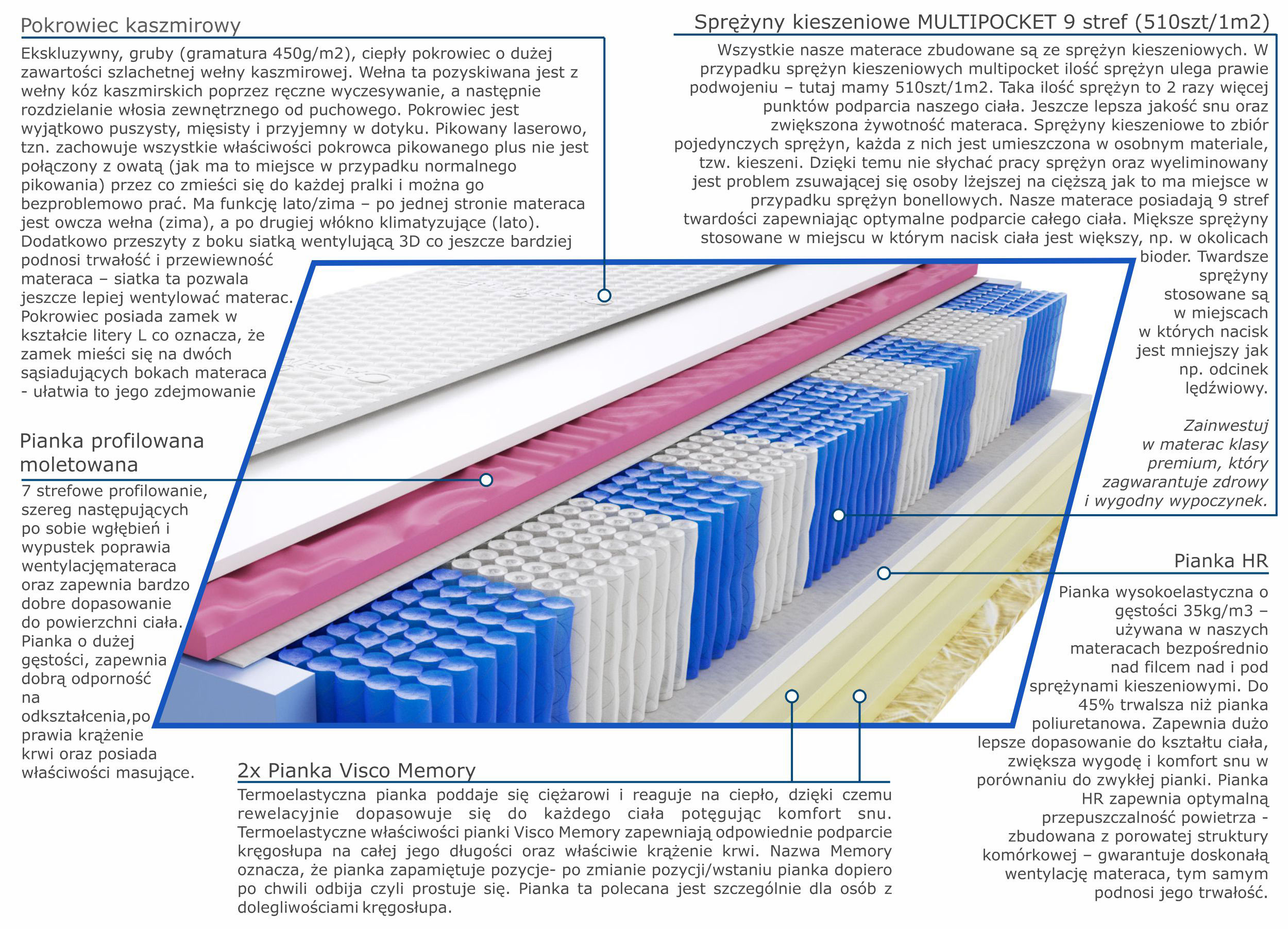 2x-visco-memory, pianka-hr, pianka-profilowana-moletowana, pianka-t25, pokrowiec-kaszmirowy, sprezyny-multipocket-kieszeniowe, wlokno-klimatyzujace