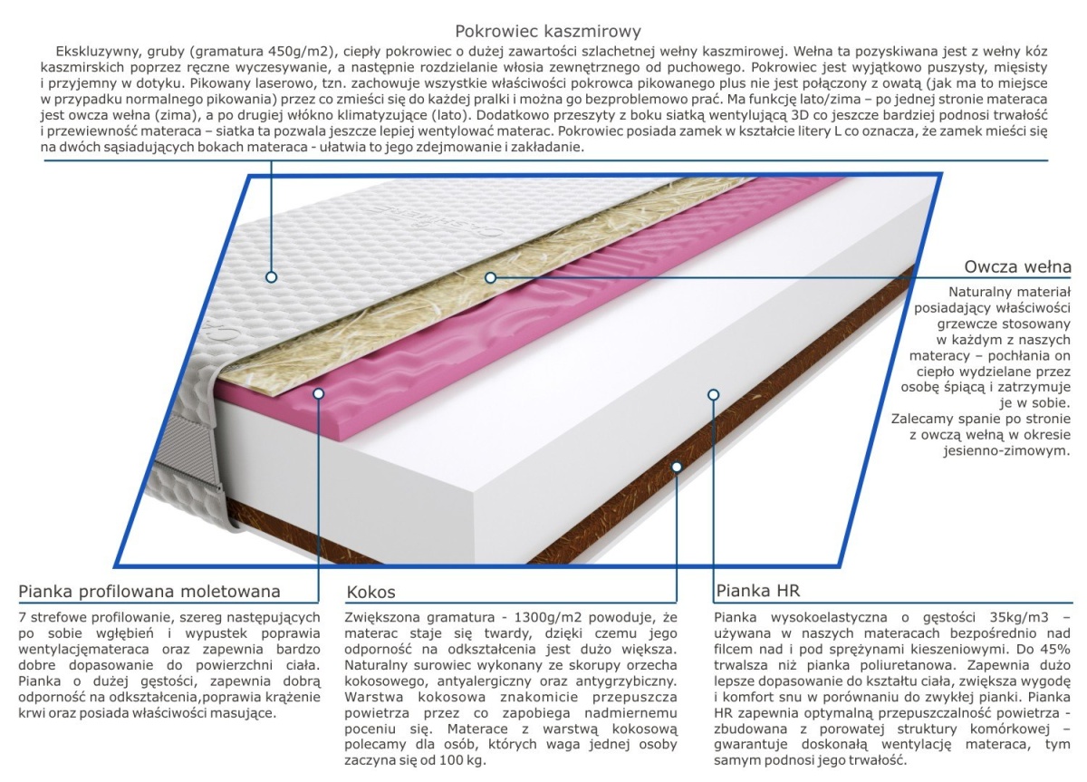 – ekskluzywny, gruby (gramatura 450g/m2), ciepły pokrowiec o dużej zawartości szlachetnej wełny kaszmirowej. Wełna ta pozyskiwana jest z wełny kóz kaszmirskich poprzez ręczne wyczesywanie, a następnie rozdzielanie włosia zewnętrznego od puchowego. Pokrowiec jest wyjątkowo puszysty, mięsisty i przyjemny w dotyku. Pikowany laserowo, tzn. zachowuje wszystkie właściwości pokrowca pikowanego plus nie jest połączony z owatą (jak ma to miejsce w przypadku normalnego pikowania) przez co zmieści się do każdej pralki i można go bezproblemowo prać. Ma funkcję lato/zima – po jednej stronie materaca jest owcza wełna (zima), a po drugiej włókno klimatyzujące (lato). Dodatkowo przeszyty z boku siatką wentylującą 3D co jeszcze bardziej podnosi trwałość i przewiewność materaca – siatka ta pozwala jeszcze lepiej wentylować materac. Pokrowiec posiada zamek w kształcie litery L co oznacza, ze zamek mieści się na dwóch sąsiadujących bokach materaca – ułatwia to jego zdejmowanie i zakładanie.